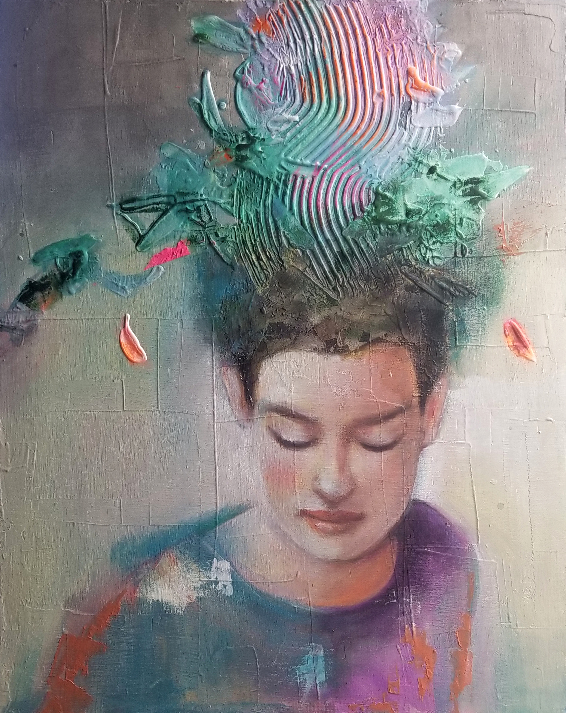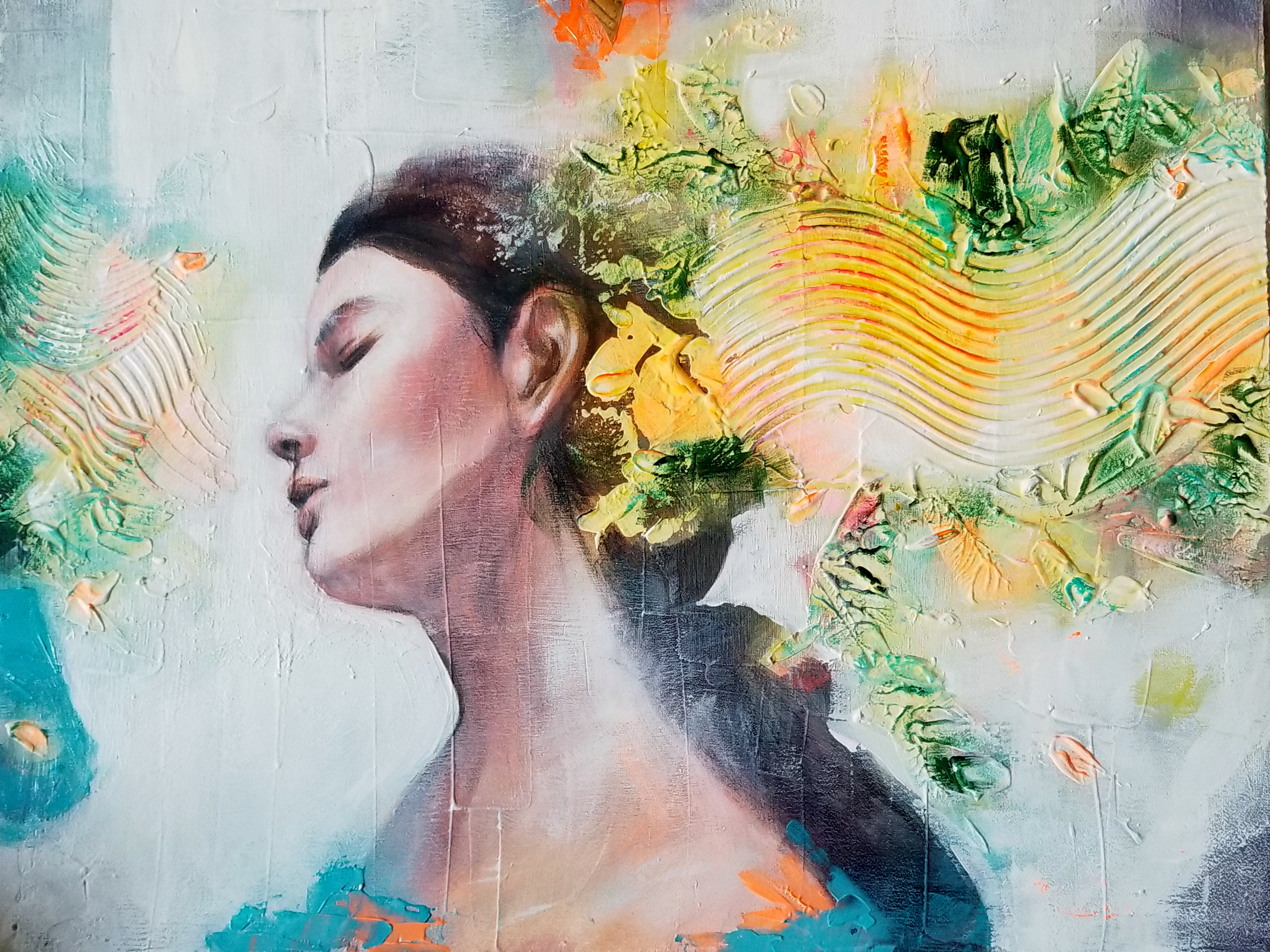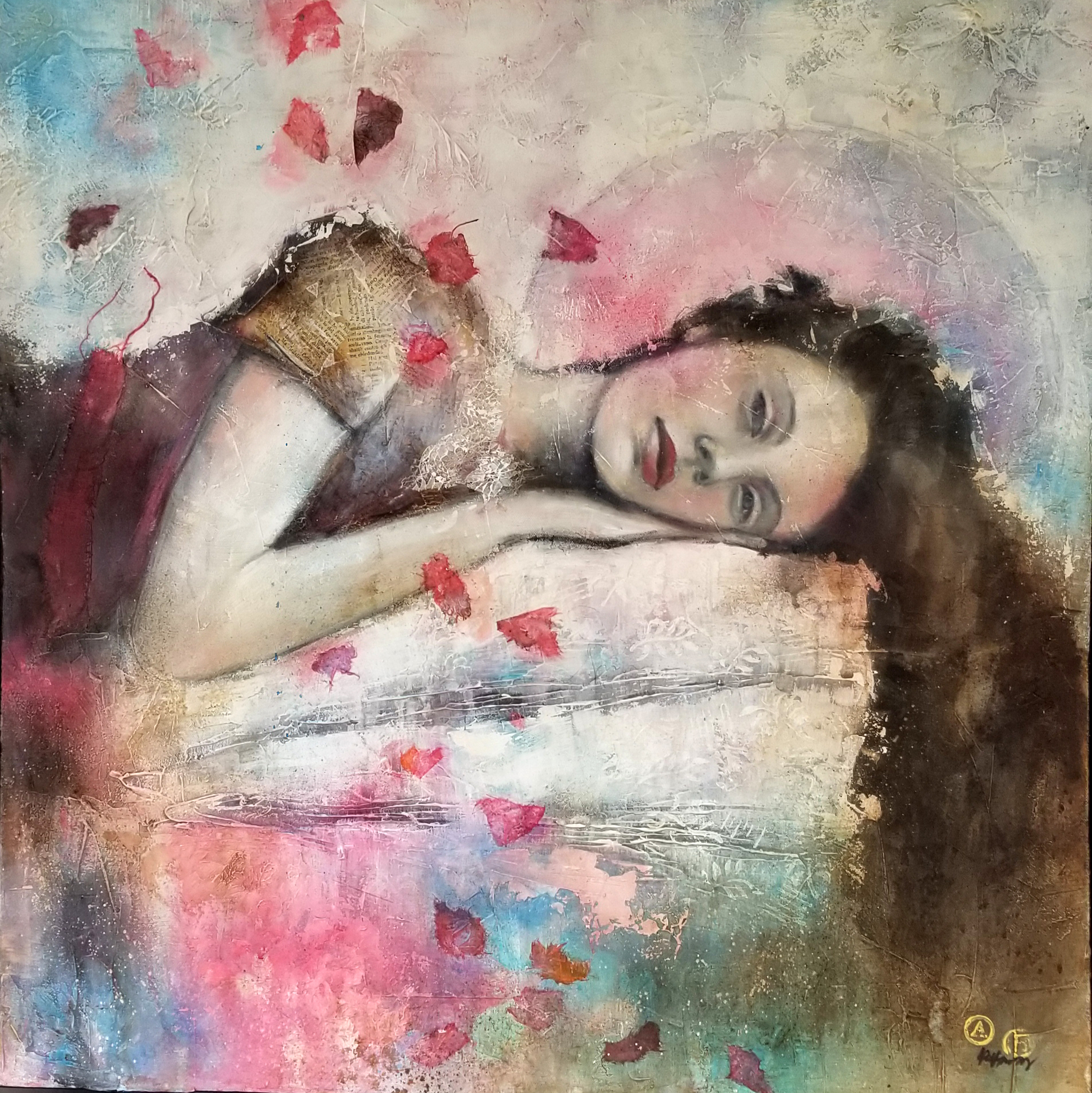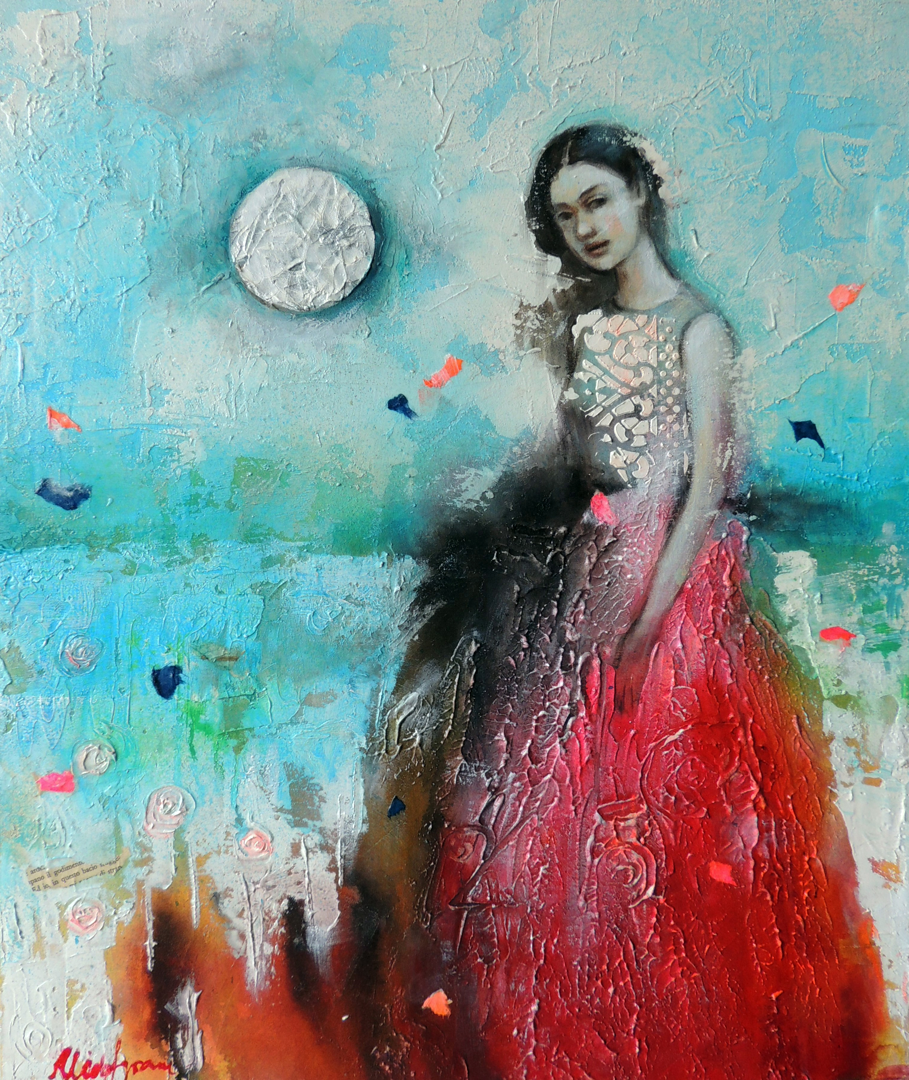 I dipinti spesso presentano una parte finemente dipinta (i volti) e sfondi elaborati, quasi astratti, dove si alternano strati di pittura materica resa con spatolate e con spruzzi di inchiostri acrilici. Di frequente le opere sono arricchite con inserti di collage (carta di riso dipinta, carte dorate, pagine di vecchi libri). E’ affascinata dal gioco degli opposti, anche tecnicamente parlando, tra la